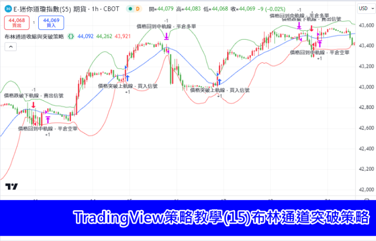• 當布林通道收縮且價格突破上軌線時,觸發買入信號。