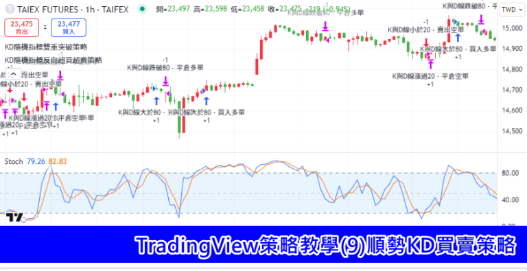 KD隨機指標是技術分析中常見的震盪指標,通常用來判斷市場的超買與超賣狀態,並捕捉市場可能的反轉點。傳統的KD策略在市場超賣時買入,超買時賣出。然而,順勢策略則採取相反的操作,當市場進入超買區時,視為趨勢強勁並進行買入操作;當市場進入超賣區時,視為趨勢疲弱並進行賣出操作。